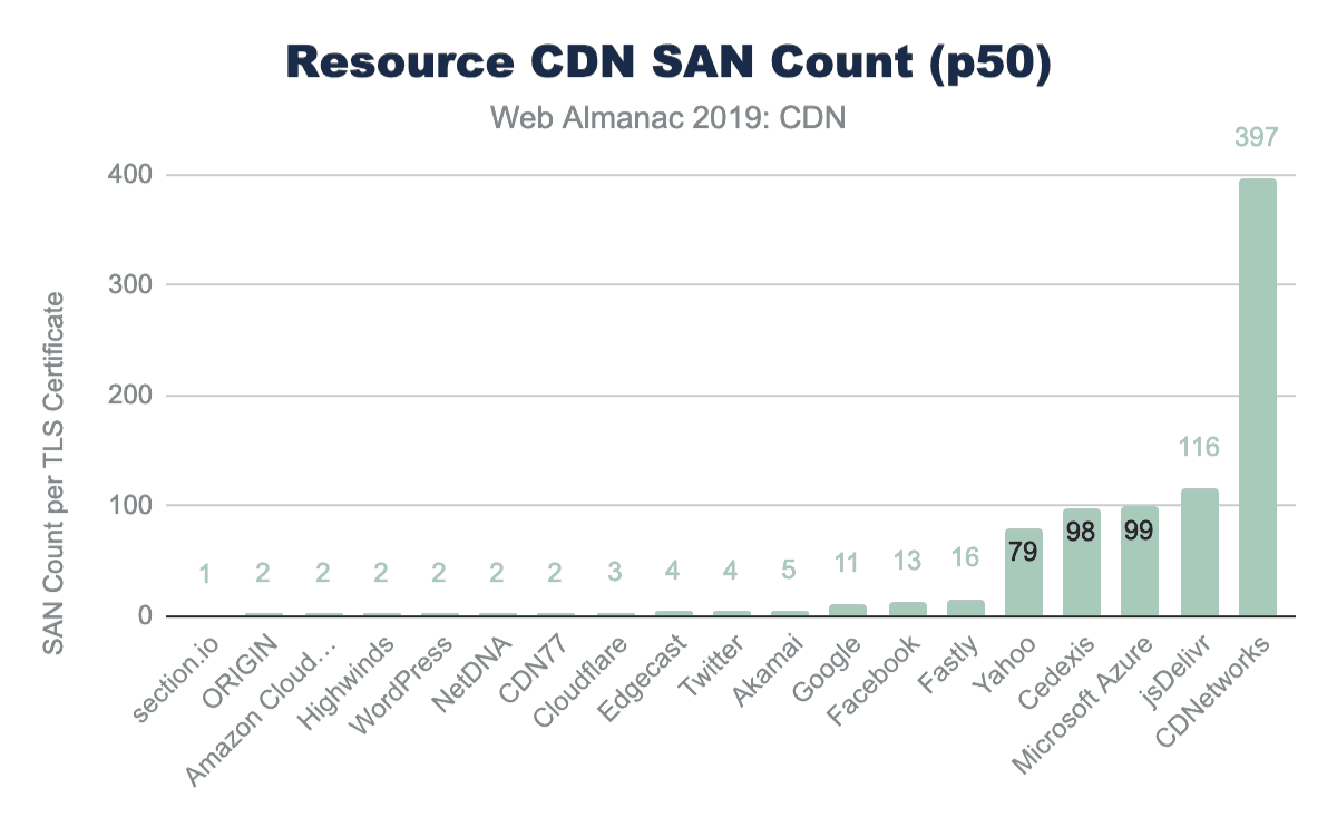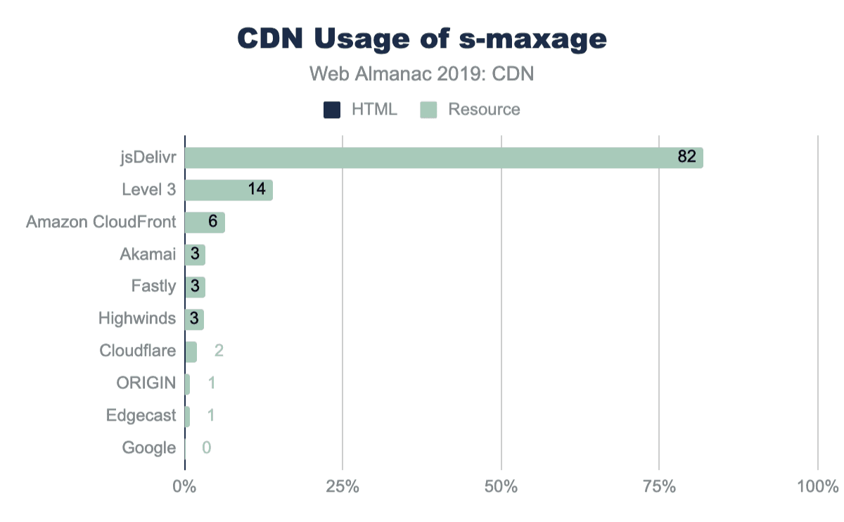 The s-maxage directive informs proxies for how long they may cache a response. Across the Web Almanac dataset, jsDelivr is the only CDN where a high level of usage was seen across multiple resources—this isn’t surprising given jsDelivr’s role as a public CDN for libraries. Usage across other CDNs seems to be driven by individual customers, for example third-party scripts or SaaS providers using that particular CDN.