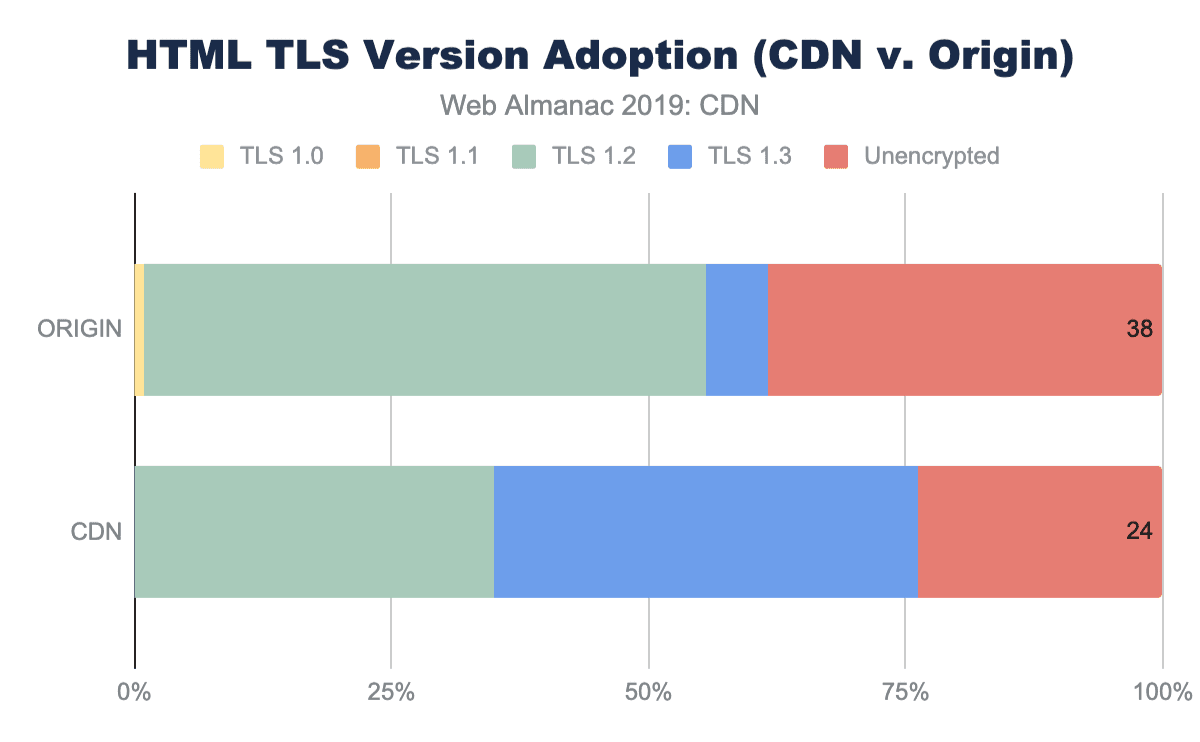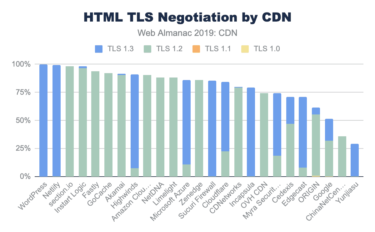 In future versions of the Web Almanac, we would expect to look more closely at the TLS and RTT management between CDN vendors. Of interest would the impact of OCSP stapling, differences in TLS Cipher performance. CWND (TCP congestion window) growth rate, and specifically the adoption of BBR v1, v2, and traditional TCP Cubic.