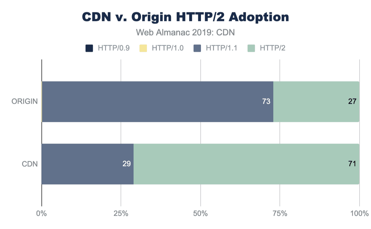 Steve Souders’ recommendation to use a CDN remains as valid today as it was 12 years ago, yet only 20% of sites serve their HTML content via a CDN, and only 40% are using a CDN for resources, so there’s plenty of opportunity for their usage to grow further.