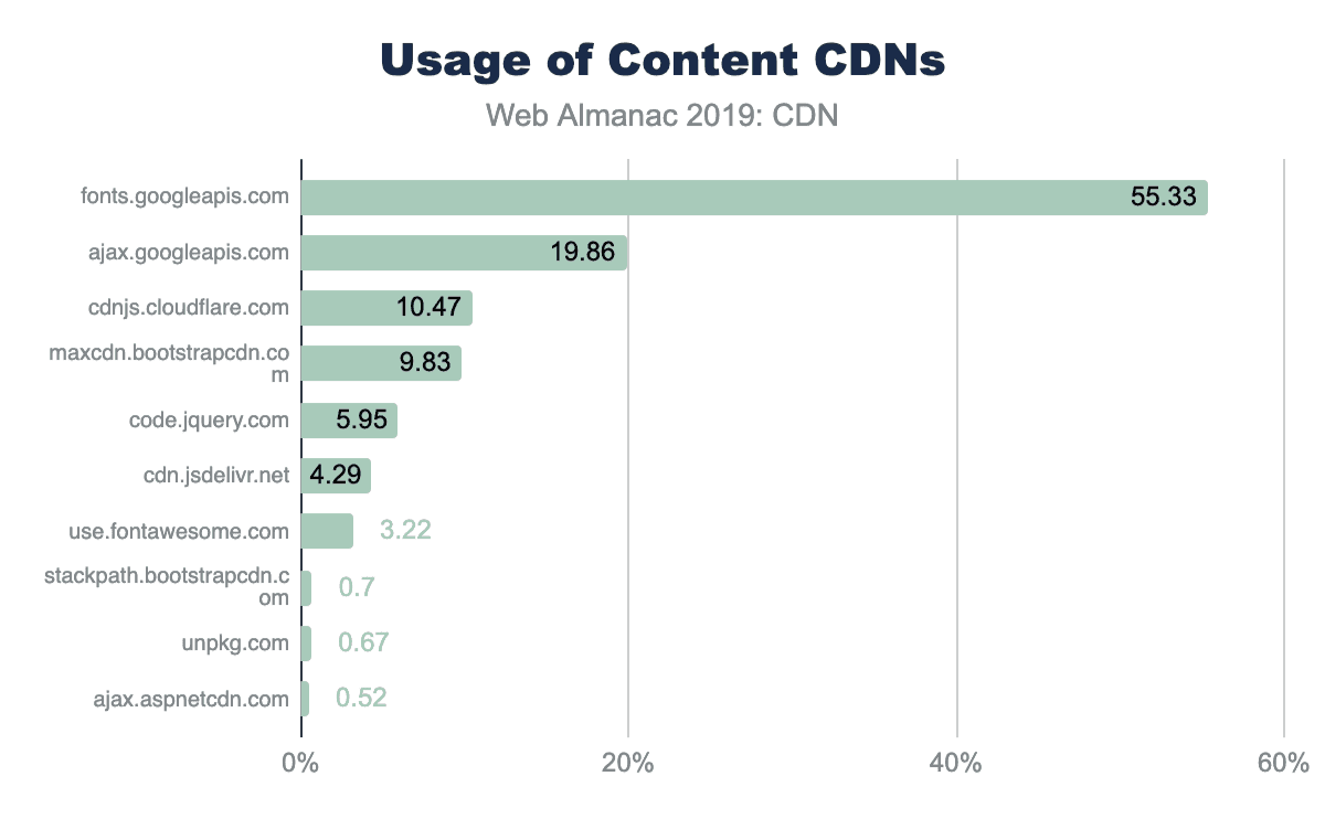 Google Fonts is the most popular of the content CDNs and is used by 55% of websites. For non-font content, Google API, Cloudflare’s JS CDN, and the Bootstrap’s CDN are the next most popular.