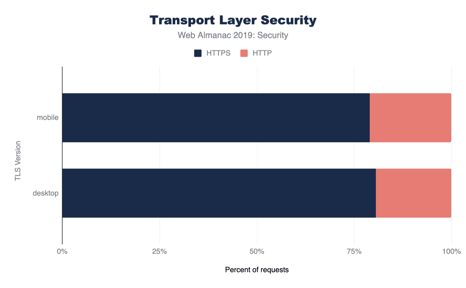 In the recent years, the web has made the most progress on the encryption of data in transit. As described in the TLS section section, thanks to a range of efforts from browser vendors, developers and Certificate Authorities such as Let’s Encrypt, the fraction of the web using HTTPS has steadily grown. At the time of writing, the majority of sites are available over HTTPS, ensuring confidentiality and integrity of traffic. Importantly, over 99% of websites which enable HTTPS use newer, more secure versions of the TLS protocol (TLSv1.2 and TLSv1.3). The use of strong cipher suites such as AES in GCM mode is also high, accounting for over 95% of requests on all platforms.