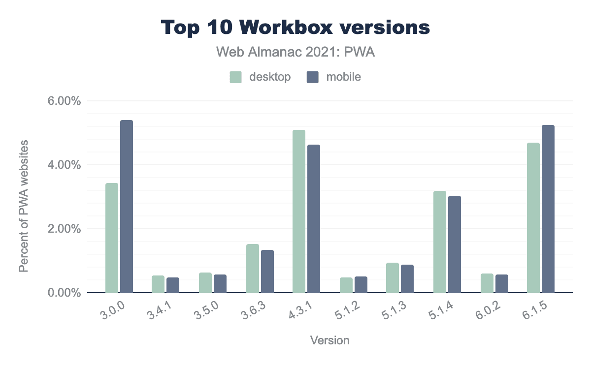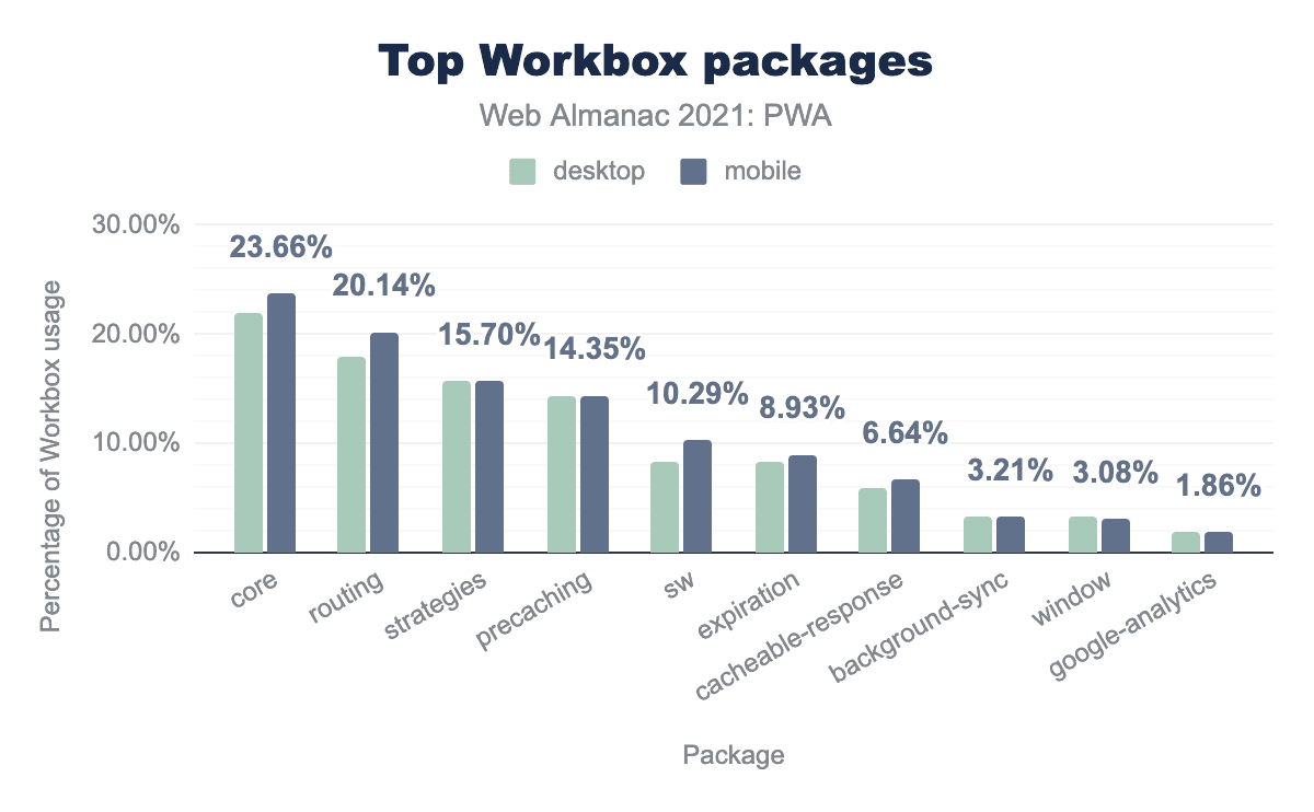 It’s also important to note that the Workbox predecessor sw_toolbox, which had 13.92% of usage in desktop and 12.84% in mobile last year dropped to 0.51% and 0.36% respectively this year. This is in part due to the fact that sw_toolbox was deprecated in 2019. It might have taken some time for some popular frameworks and build tools to remove this package, so we are seeing the drop in adoption more clearly this year. Also, our measurement has changed compared to 2020, by adding more sites, which made this metric decrease even more, making it difficult to do a direct year on year comparison.