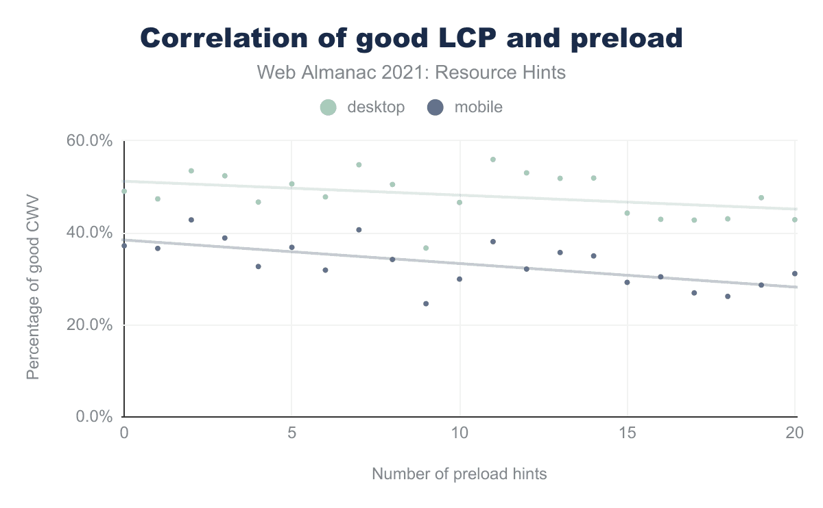 By combining a page’s Core Web Vitals scores in the CrUX dataset and the usage of the preload resource hint, you can observe a negative correlation between the number of link elements and the percentage of pages which score a good rating on CWV. The pages which use fewer preload hints are more likely to have a good rating.