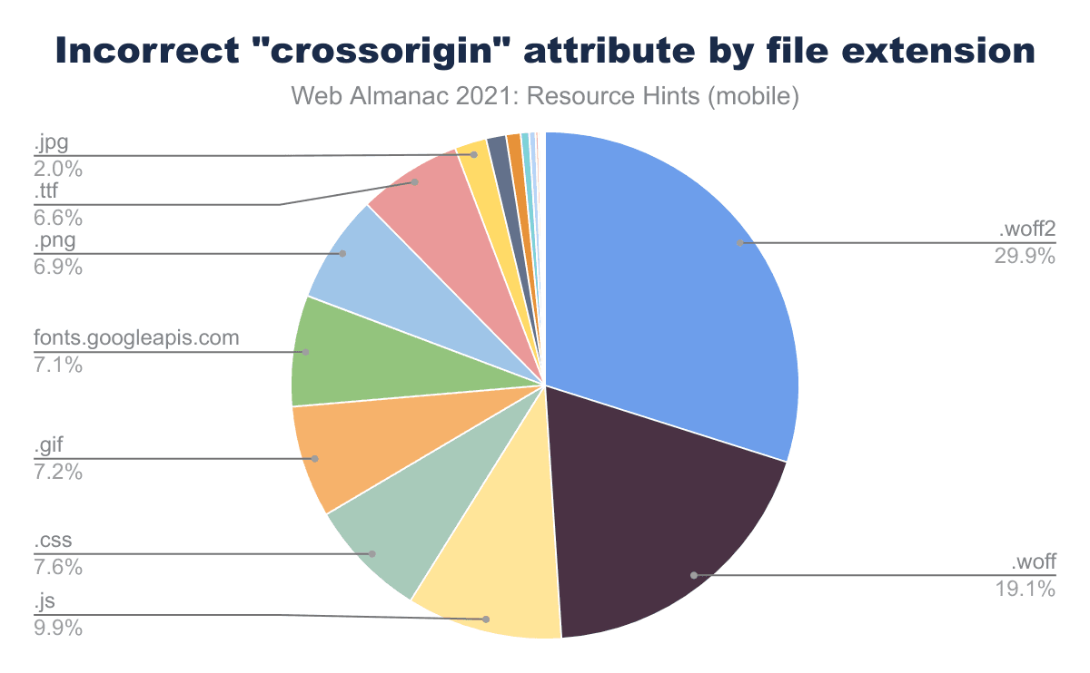 Figure 20.12. Percent of incorrect crossorigin values segmented by file extension on mobile devices.