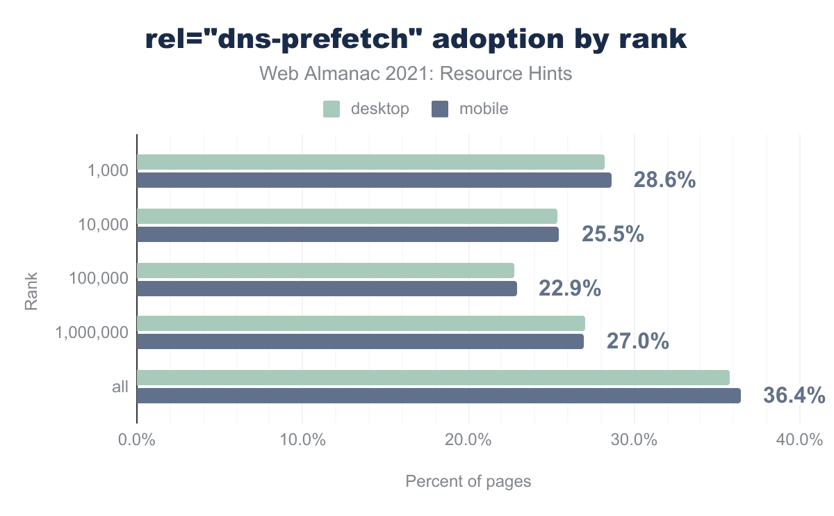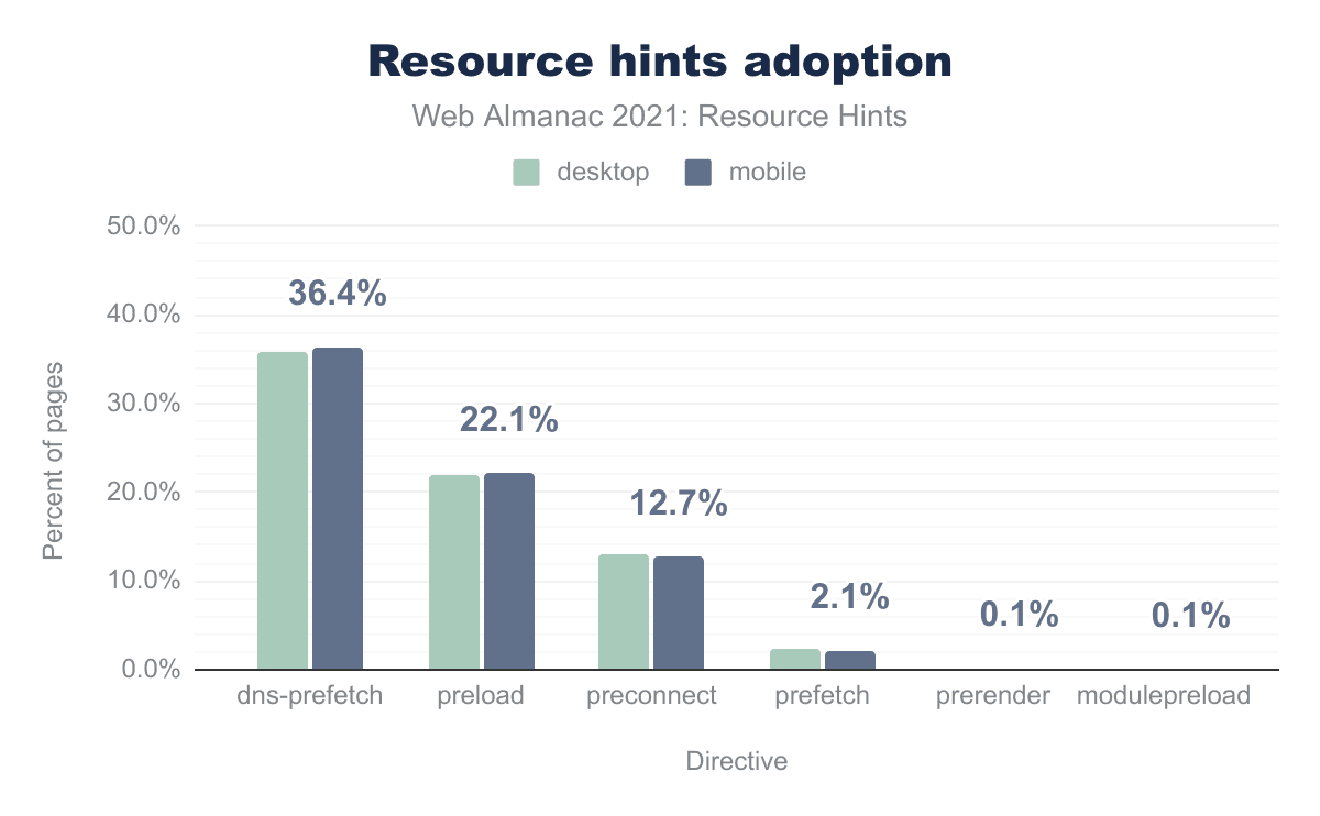 The most widely used resource hint is dns-prefetch (36.4% on mobile); which is unsurprising, considering it was introduced in 2009. With the widespread use of HTTPS, in many cases you should replace it with preconnect (12.7% on mobile), if you are certain that you will be connecting to that domain. Considering that the preload hint is comparatively new, first appearing in Chrome in 2016, it is the second most widely adopted resource hint (22.1% on mobile) and is seeing constant growth year-on-year—a testament to the importance and flexibility of this directive.