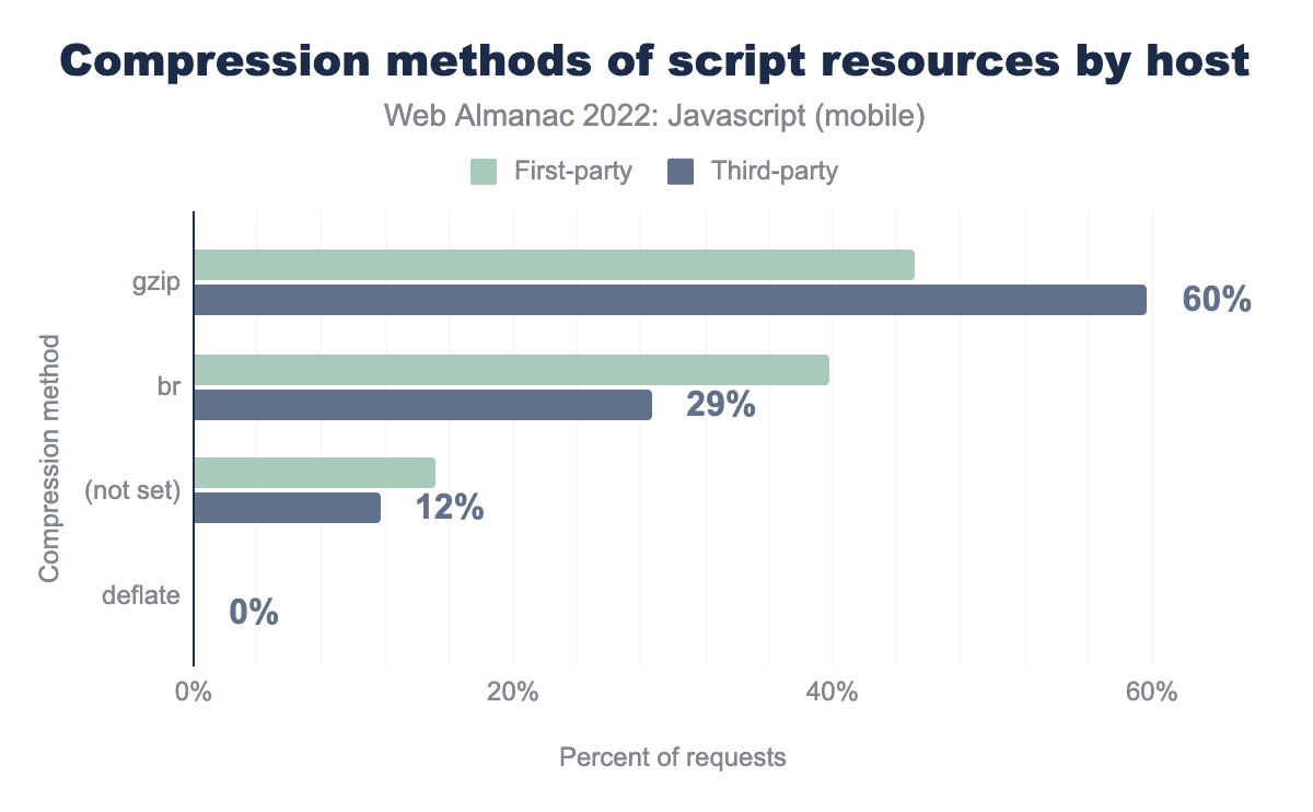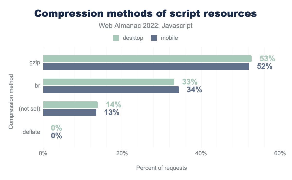 The manner in which JavaScript is requested may also have performance implications. There are optimal ways you can request JavaScript, and in some cases, there are far less optimal methods. Here, we’ll see how the web is shipping JavaScript overall, and how that aligns with performance expectations.