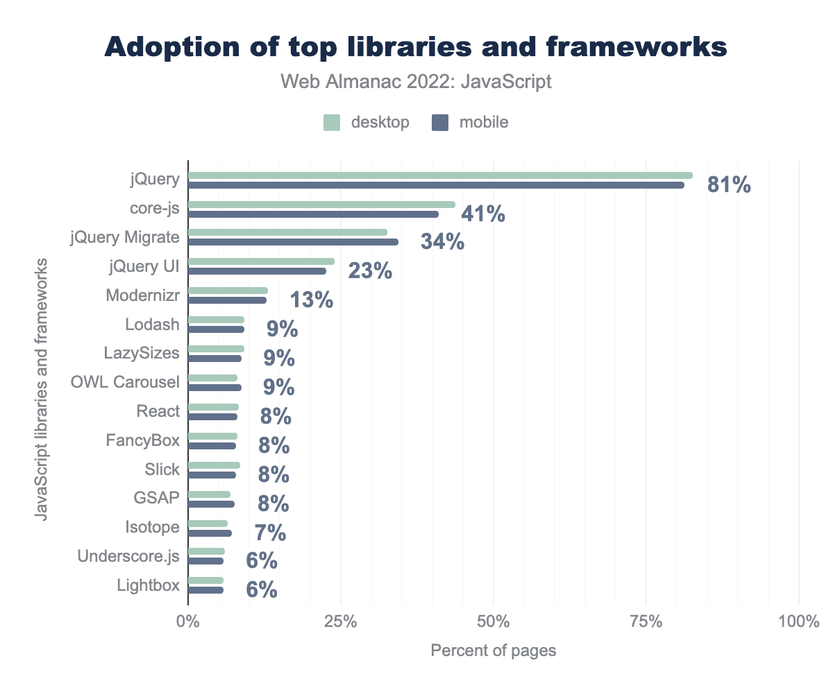 Libraries and frameworks are a huge part of the developer experience—one that has the potential to harm performance through framework overhead. Though developers have largely accepted this trade-off, understanding what libraries and frameworks are commonly used on the web is extremely important, as it informs our understanding of how the web is built. In this section, we’ll be taking a look at the state of libraries and frameworks across the web in 2022.