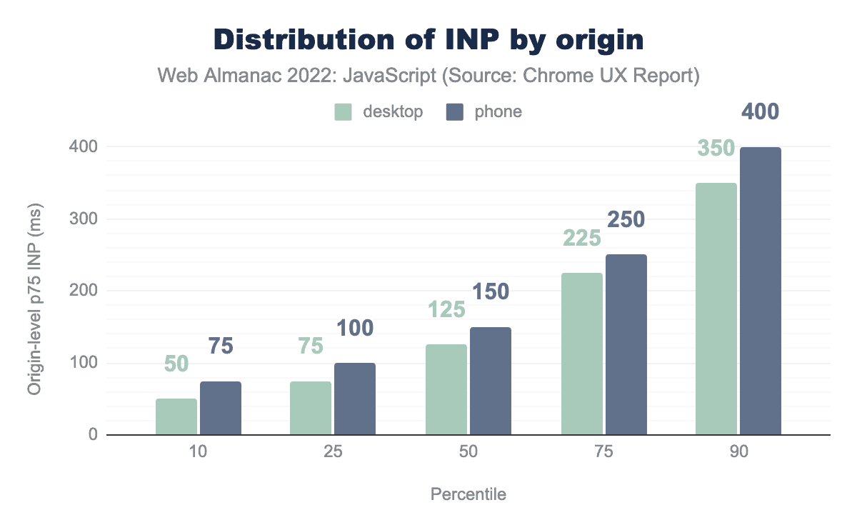 Consider that a “good” INP score is 200 milliseconds or less. At the median, both mobile and desktop score below this threshold, but the 75th percentile is another story, with both mobile and desktop segments well within the “needs improvement” range. This data, quite unlike FID, suggests that there are many opportunities for websites to do everything they can to run fewer long tasks on pages, which are a key contributor to less-than-good INP scores.