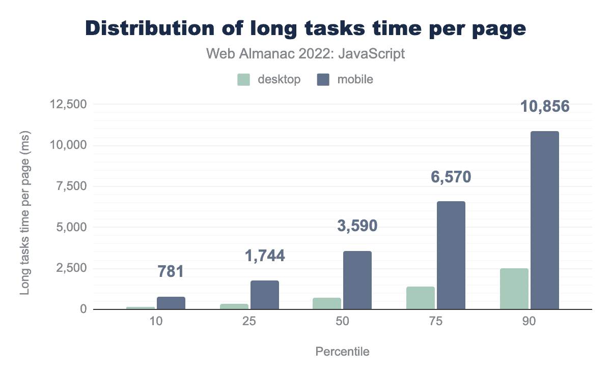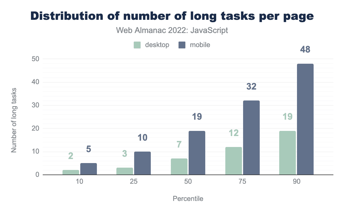 The median page encounters 19 long tasks on mobile and 7 long tasks on desktop devices. This makes sense when you consider that most desktop devices have greater processing power and memory resources than mobile devices, and are actively cooled.