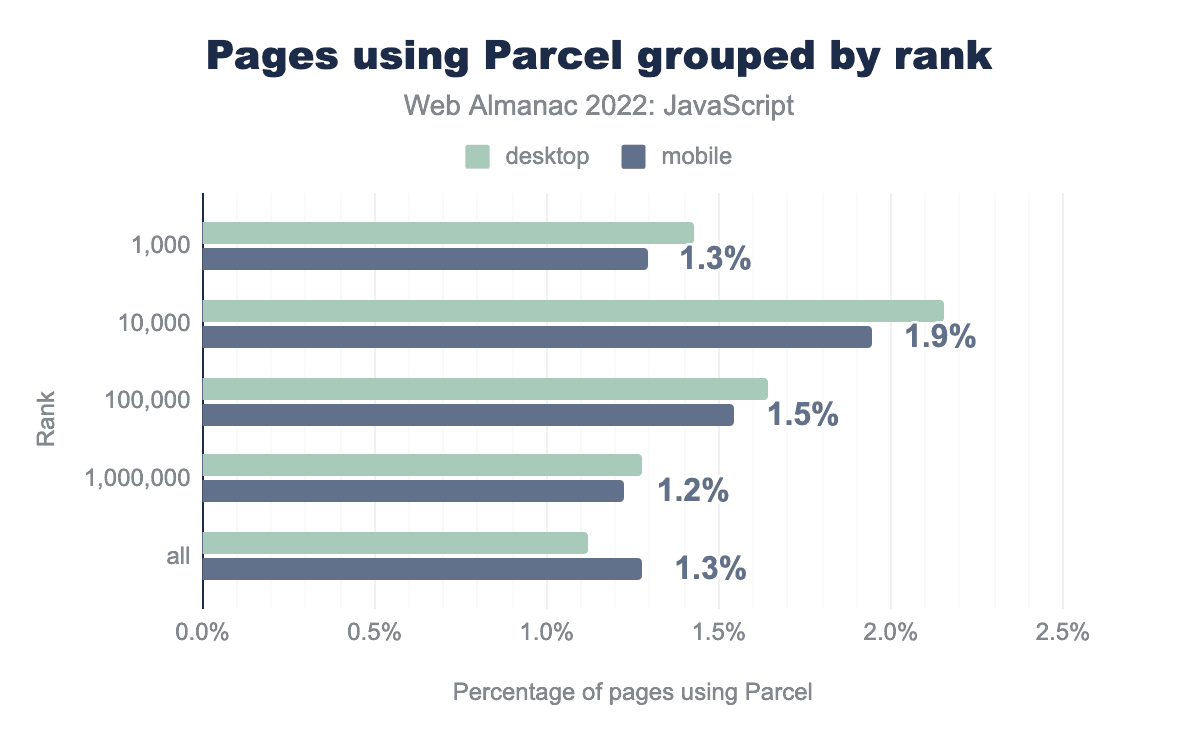 Parcel is a noteworthy alternative to webpack, and its adoption is significant. Parcel’s adoption is consistent across all ranks, accounting for a range of 1.2% to 1.9% across rankings.