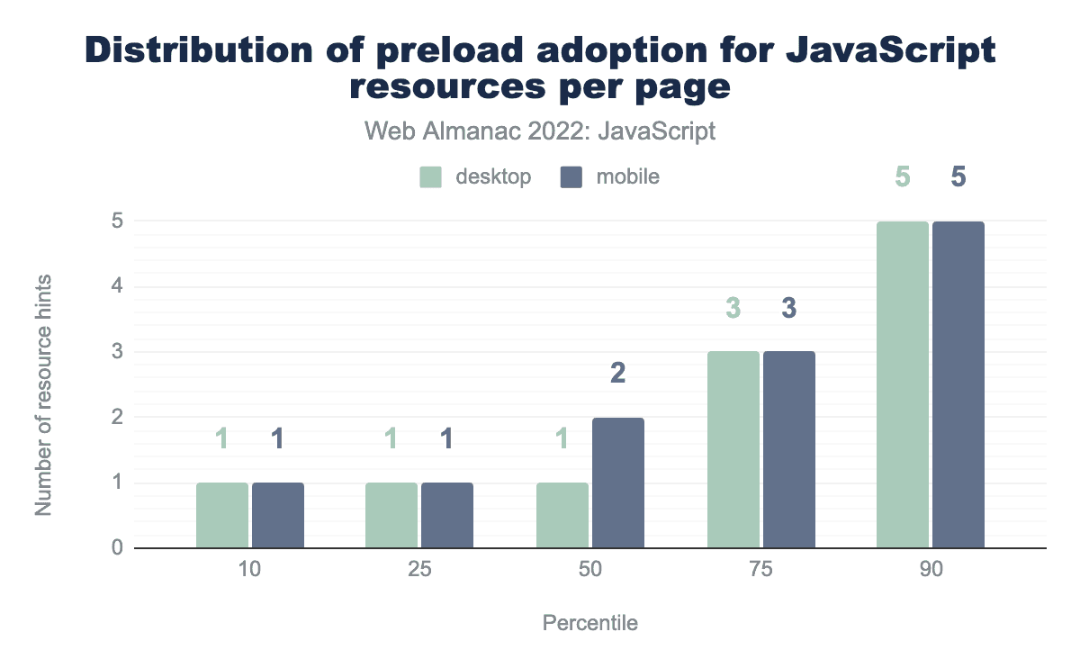 Unfortunately, we see five preload hints for JavaScript resources at the 90th percentile, which may be too much. This suggests that pages at the 90th percentile are especially reliant on JavaScript, and are using preload to try and overcome the performance issues that result.