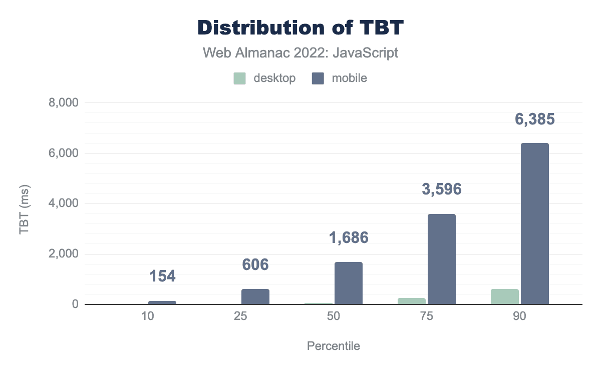 Note that unlike the preceding stats on FID and INP, TBT and TTI (below) are not sourced from real-user data. Instead, we’re measuring synthetic performance in simulated desktop and mobile environments with device-appropriate CPU and network throttling enabled. As a result of this approach, we get exactly one TBT and TTI value for each page, rather than a distribution of real-user values across the entire website.