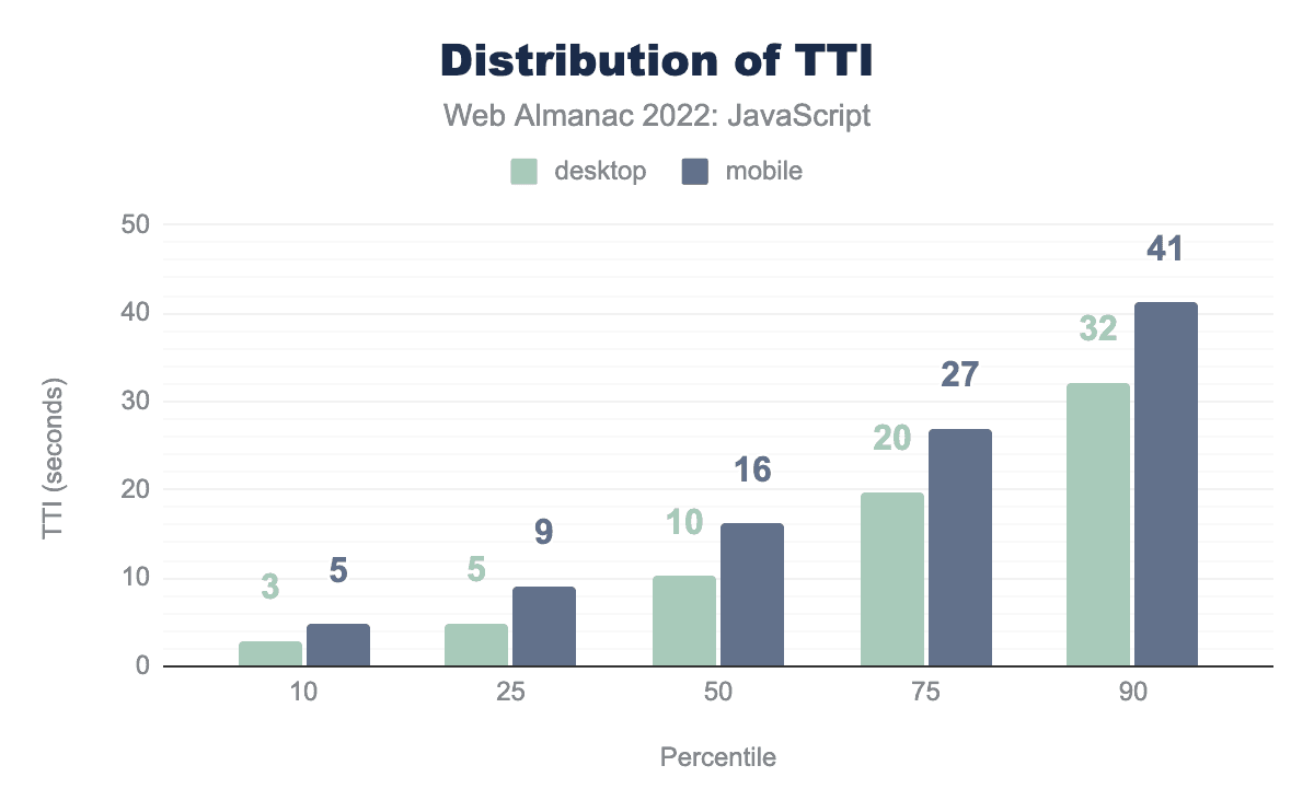 Finally, we come to Time to Interactive (TTI), which is considered “good” if the metric comes in at under 5 seconds. Given that only the 10th percentile barely slips in under the 5 second mark, most websites in our simulated environment are relying on JavaScript to such an extent that pages are unable to become interactive within a reasonable timeframe—especially the 90th percentile, which takes a staggering 41.2 seconds to become interactive.
